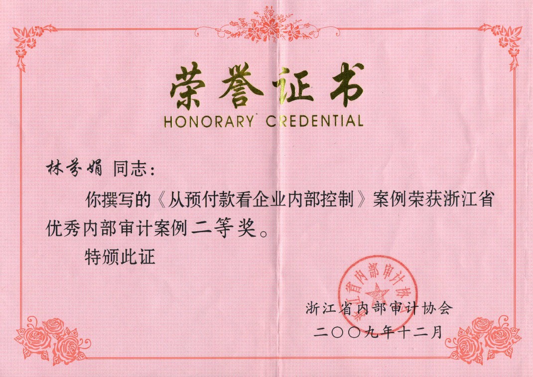 克日,从绍兴市内部审计师协会传来喜讯,审计部选送的《由一件工程舞弊案件引发的思索》荣获浙江省内审案例评选二等奖、市内审案例评选一等奖。同时,转达还表扬了2009年度优异内审项目,审计部的《2009年1-7月药品销售公司退货情形审计》项目获得市内审项目二等奖。之前,审计部司理林芬娟撰写的《从应收款看企业内部控制》一文,也一经获得过浙江省内部审计案例二等奖。